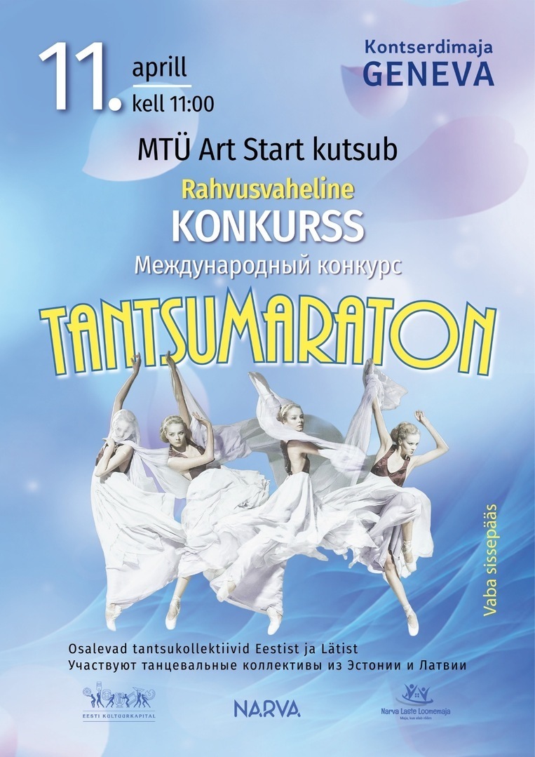 Rahvusvaheline konkurss Tantsumaraton Toimumisaeg L 11.04.2026, 11:00 Asukoht KM Geneva Täpsemalt Rahvusvaheline konkurss Tantsumaraton Vastutaja Jelena Stepanova jelena.stepanova@nll.ee