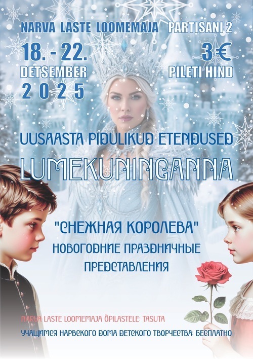 Meil on rõõm teatada, et alates 27. novembrist on avatud piletimüük uusaasta pidulikele lasteetendustele Lumekuninganna  Narva Laste Loomemajas linna elanikele ja külalistele!